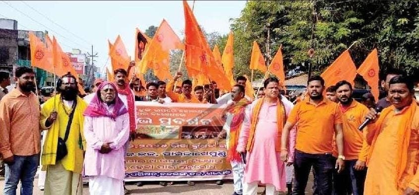 Paralakhemundi,(Tarini Prasad Panda):Bangladesh atrocities on Hindus deflected hue & cry in India.So by Viswa Hindu Parishad of Gajapati district agitation organized with a massive rally from Jagannath temple.They marched whole town with slogans against Bangladesh for their radical attitude to kill Hindus.So they demanded to throw out illegal entry of Bangladesh people in India.Bajrang Dal too joined in this rally.